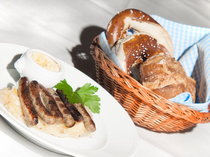 Gegrillte Schweinshaxe, gebratenes Schäufele (aus der Schweinsschulter mit Kruste), original Nürnberger Rostbratwürste und Wiener Schnitzel vom Kalb, dazu gibt es Kartoffelknödel (2,3), warmen Kartoffelsalat, frisches Sauerkraut mit Speck (2) und Apfelblaukraut (3)